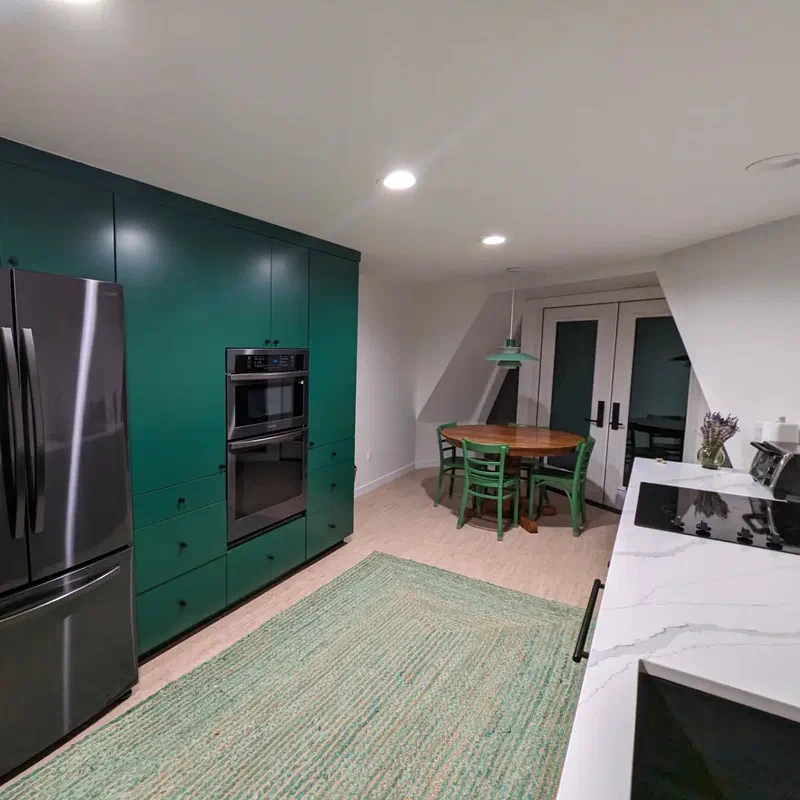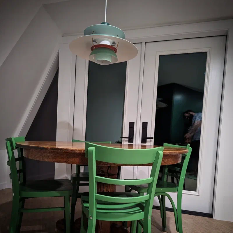 gallery posted on Oct 3, 2023 11:09 PM from @thedomeontherock ‹ › 1 / 4I love how this kitchen ended up.The lights (the green PH5 by Louis Poulsen and a botanico by @sazerac_stitches ), the trees, the greens, the wood.Just so peaceful.← Fresh Chagall on the hood for the harlequin. Let's try that again... →